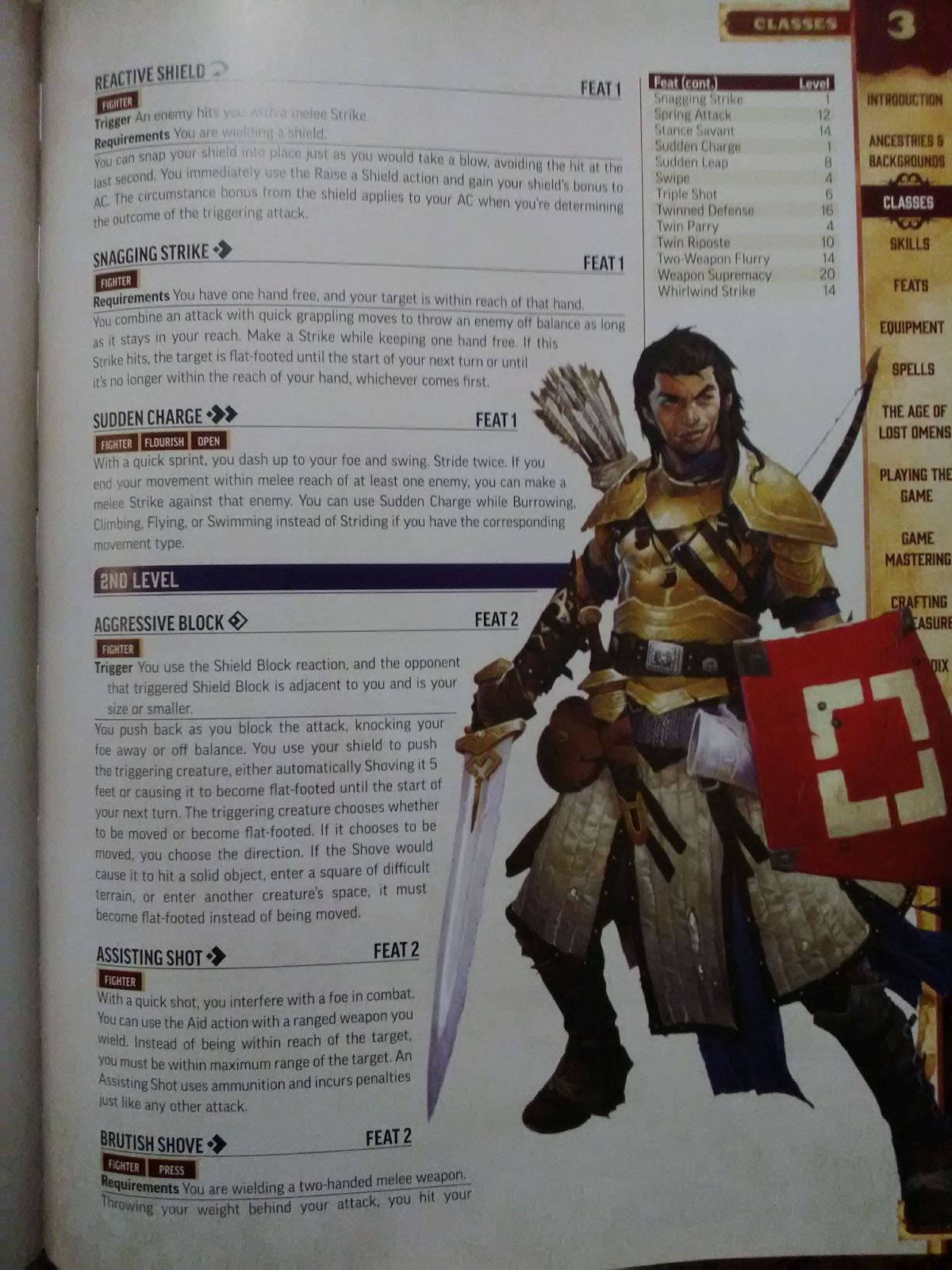 - Shield Block - this is a bonus feat Fighters get. Now, I totally hate how 2e treats shields. Combat in Pathfinder is actually quite abstract, hit points represent luck and exertion as well as physical damage, and armor class represents the ability to dodge as well as to absorb blows. This is the legacy that was inherited from Dungeons and Dragons. Which is why it's always baffled me why Pathfinder 1e was so precisely simulation-ist with things like DR (which was never used with Armor by default, the one place it would make the most sense if you want to model reality) and the combat grid. Weirdly 2e has decided to double-down on that in some ways, shields being most notable. In 1e shields we're abstracted as a bonus to your armor class (ie, odds of not getting hurt) and that was it, you just had to remember a few times when you didn't get your shield bonus. 2e decided that was too simple, now you have to take one of your 3 actions each turn to "Raise a Shield" in order to get that AC bonus, and then you can use the Shield Block feat to spend your Reaction (ability to act on someone else's turn, you only get one each turn, period) and use your shield as DR, but both you and the shield take any damage above it's hardness and so you now also have to track your shield's HP to check for when it breaks. Oh yeah, and since the Shield Block takes your reaction, you can't both block and use your Attack of Opportunity. Now, this does give you another layer of defense with a shield, which is not a bad thing, but it also adds the bookkeeping of taking the action every turn just to get the bonus, guessing if you should use your AOO or block or any other reactions each turn, and it just feels super stupid that you can forget to use your shield, or watch shield after shield break while your sword never does (nothing I'm aware of yet specifically damages weapons).