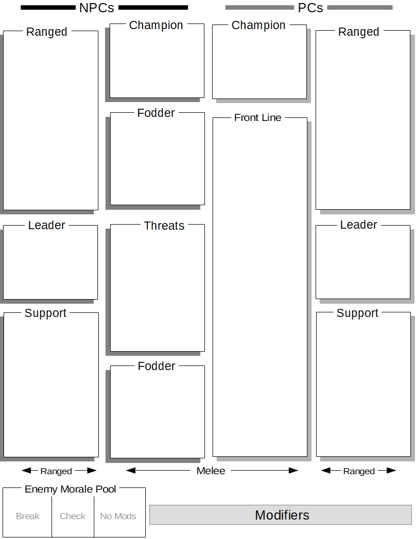 What I came up with is pictured to the side, dividing up the battlefield by the roles involved. This is not a totally original idea, The One Ring RPG by Cubicle 7 uses something similar (a little from the D&D 4th ed combat roles too). I'm adapting it in a more free-form way however. You can just use the boxes without worrying about the roles to have a good idea of where everybody is, put your miniature or token in the corresponding space. Or you could get more detailed, adding bonuses or penalties to each role to help make combat more tactical without the foot-counting precision of a grid.